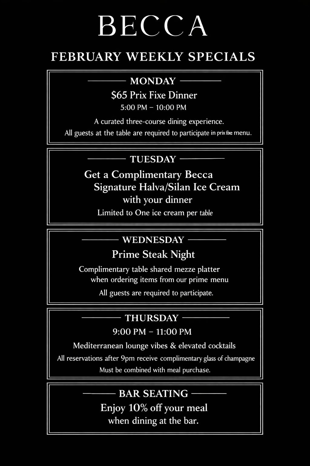 At Becca, we bring the warmth and richness of Mediterranean cuisine to an intimate, sophisticated setting. Our menu celebrates fresh ingredients, bold flavors, and timeless techniques passed down through generations.
